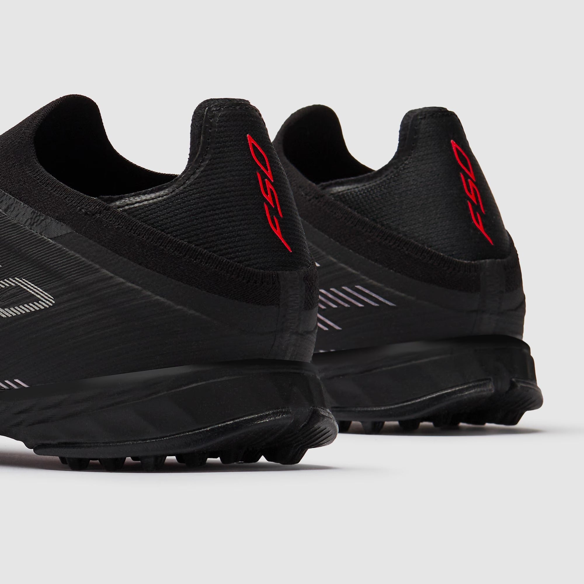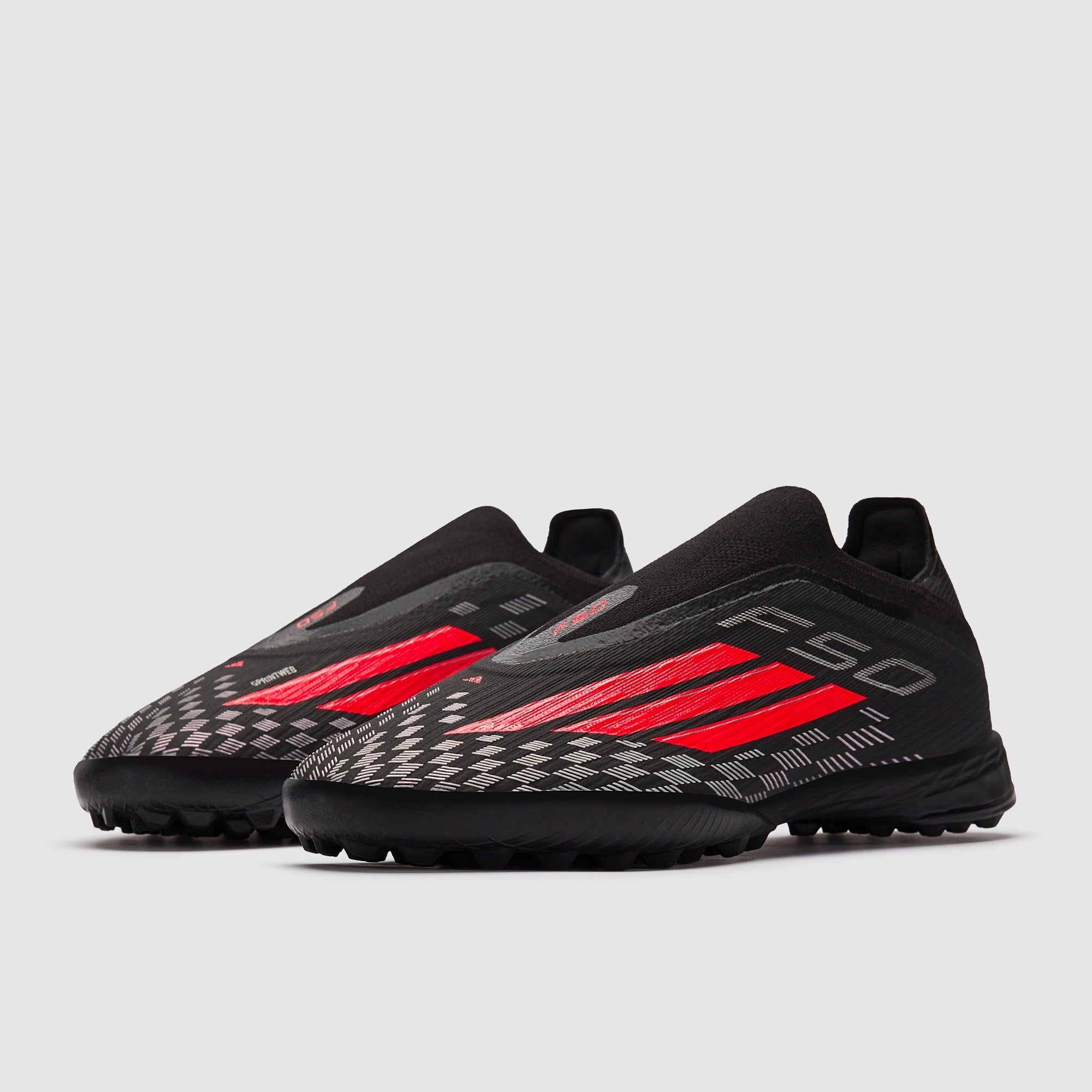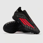 Redefine speed wearing adidas F50 Pro Laceless TF football shoes in Core Black/Lucid Red/Core Black.
